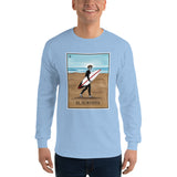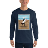 This Surfer tee is a skeleton with a day of the dead design in a Loteria style card. This long-sleeve tee has ribbed cuffs and a classic-fit. It's quarter-turned to eliminate center creasing and perfect for chilly days!
